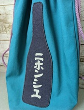 前面に縫い付けた、酒ビン型のワッペンには